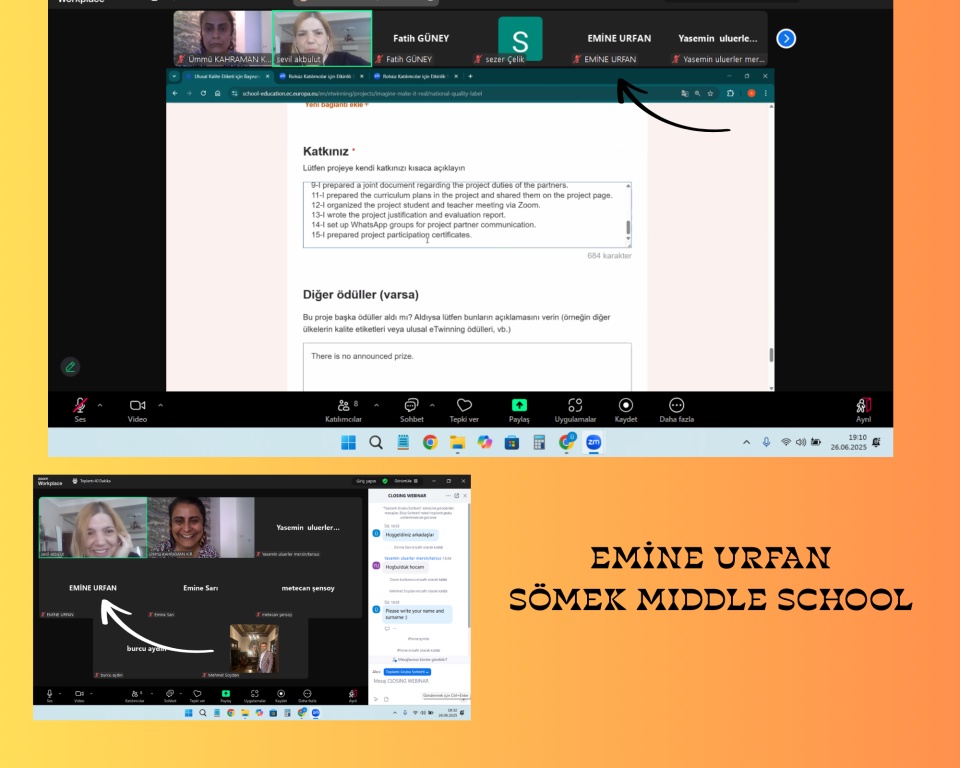 Webinara, Türkiye ve Romanya’dan proje kurucuları ve partnerleri katılım sağladı. Okulumuzdan okul müdür yardımcımız aynı zamanda projemizin kurucusu Ümmü KAHRAMAN KIR ve fen bilimleri öğretmenimiz Emine URFAN da katıldı. Etkinlik, proje sürecinin değerlendirilmesi, ortak ürünlerin paylaşımı ve deneyimlerin aktarılması açısından son derece anlamlı geçti.